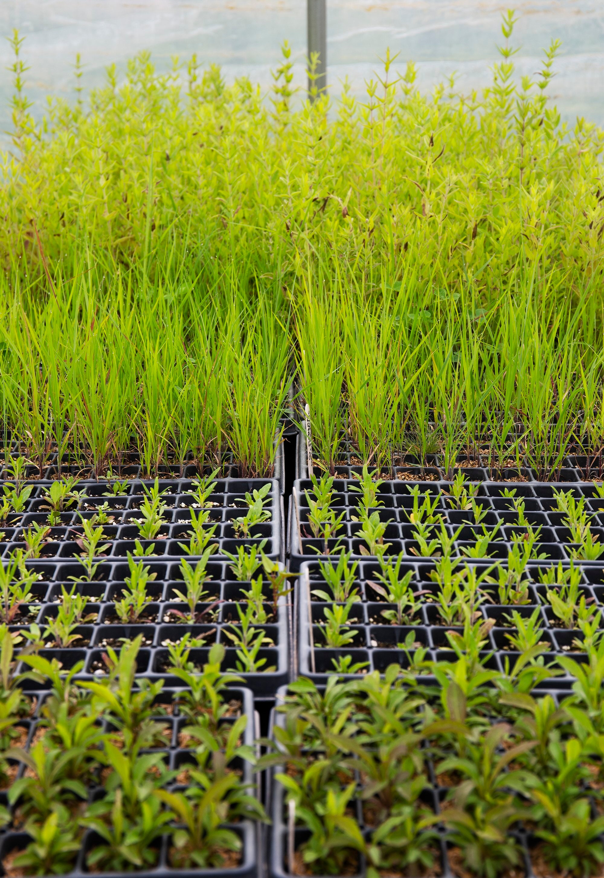 We grow a lot of mature plants from plugs. We like plugs! They are easier to plant on a large scale than quarts or gallons, saving money with less time spent planting. Smaller plants are more economical and also have higher survival rates than larger, more mature specimens.